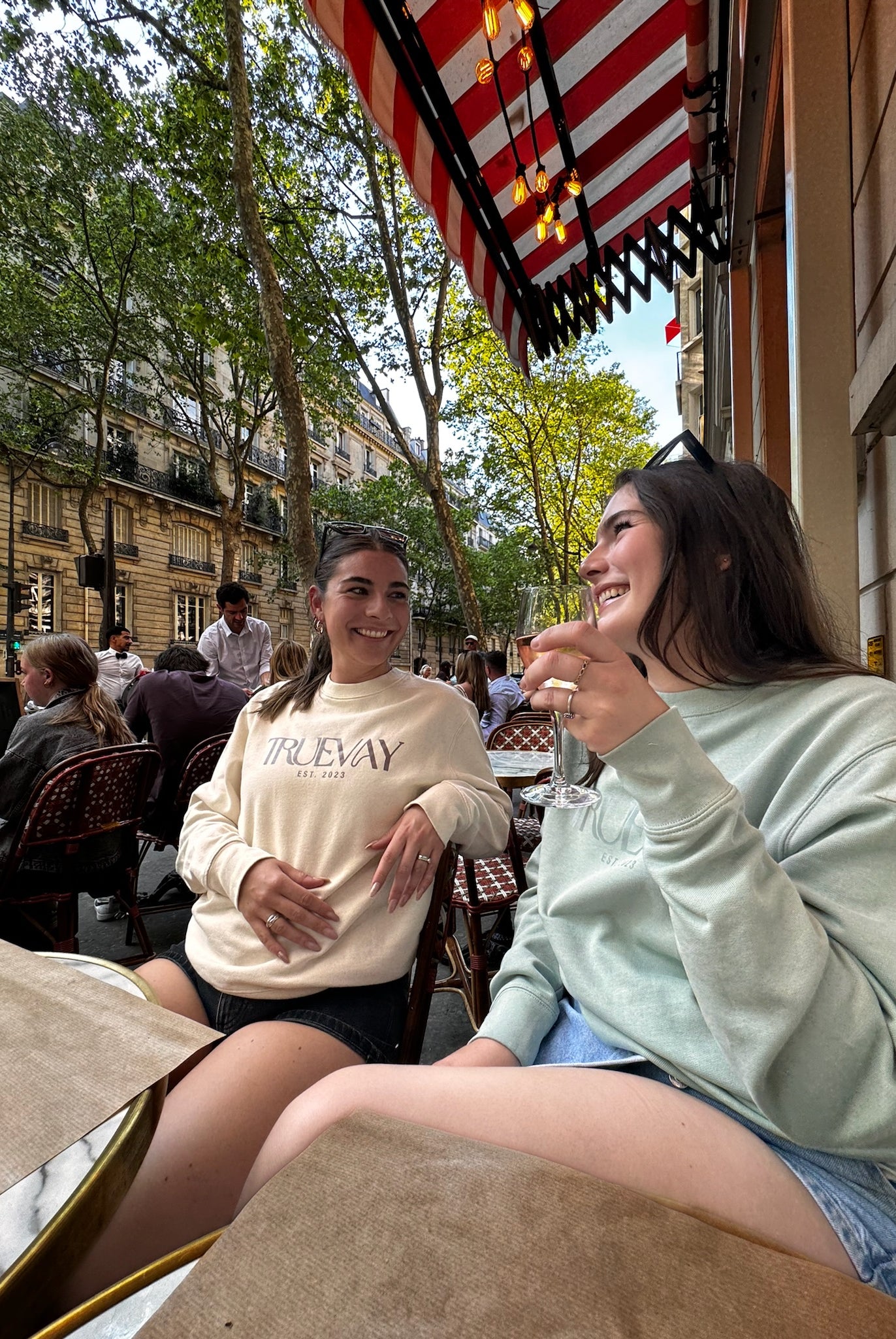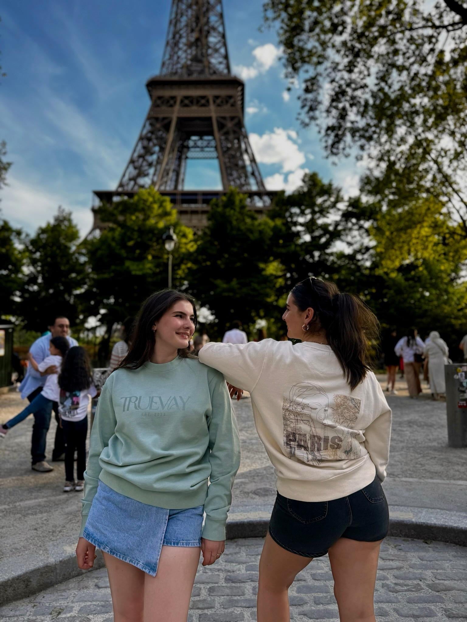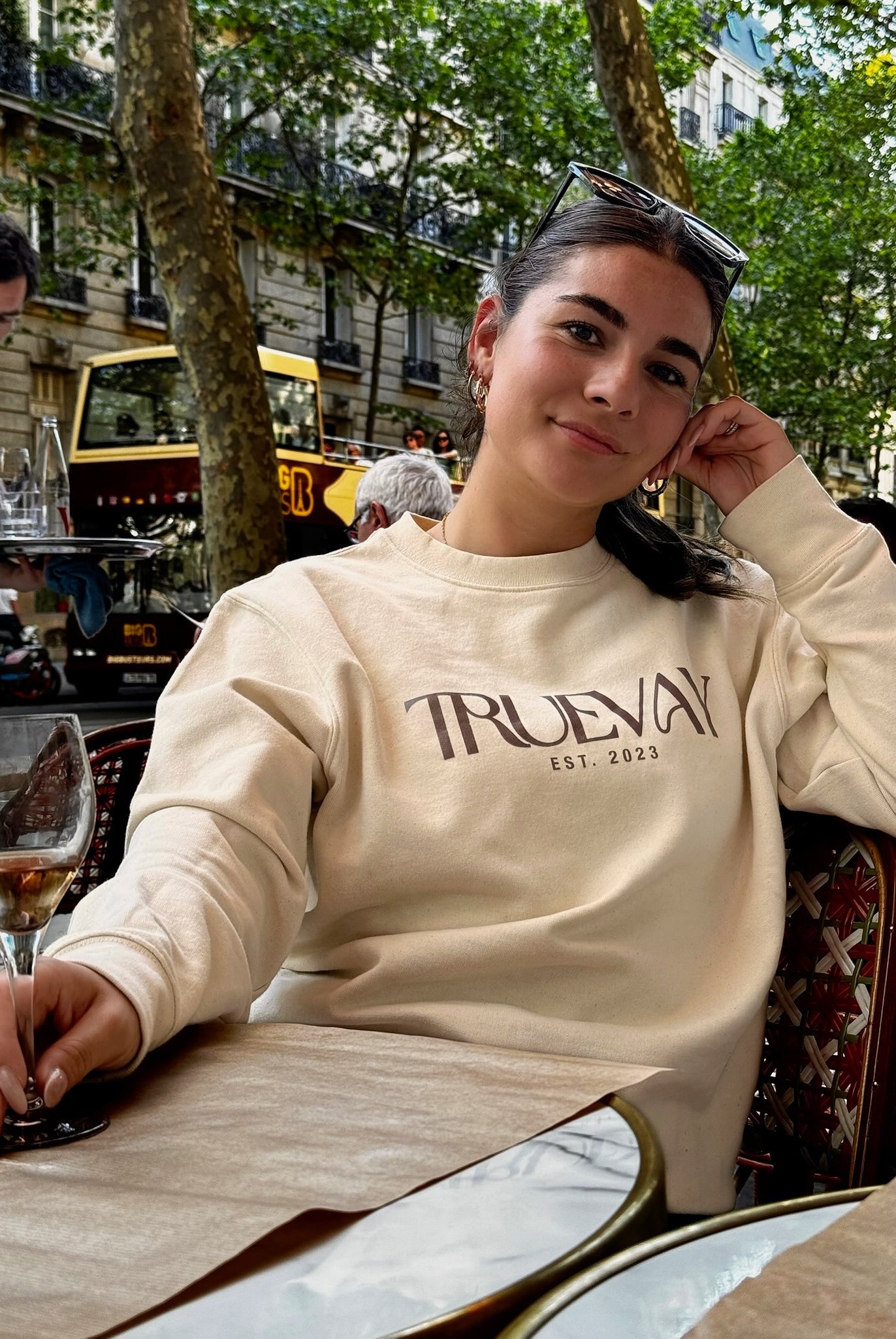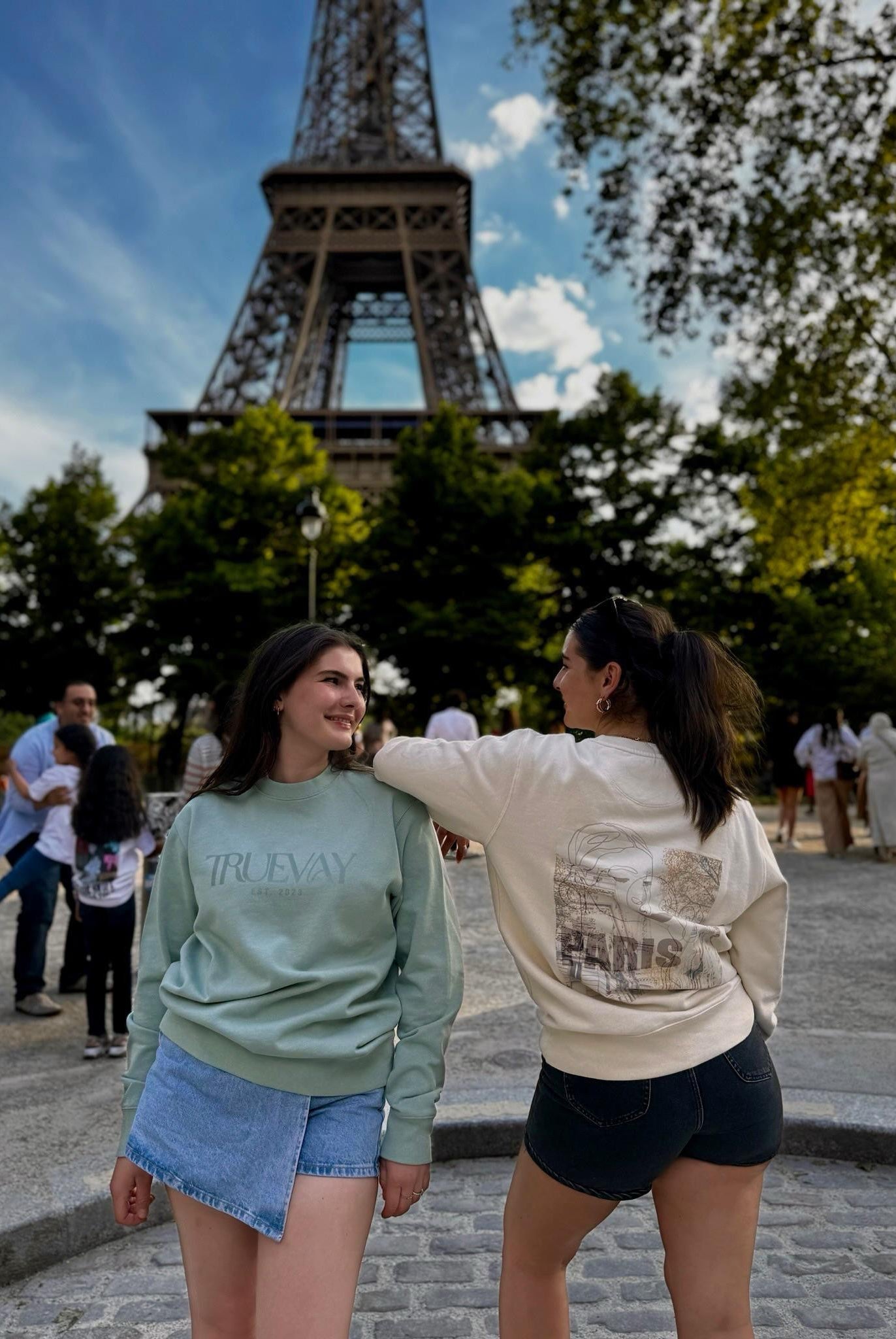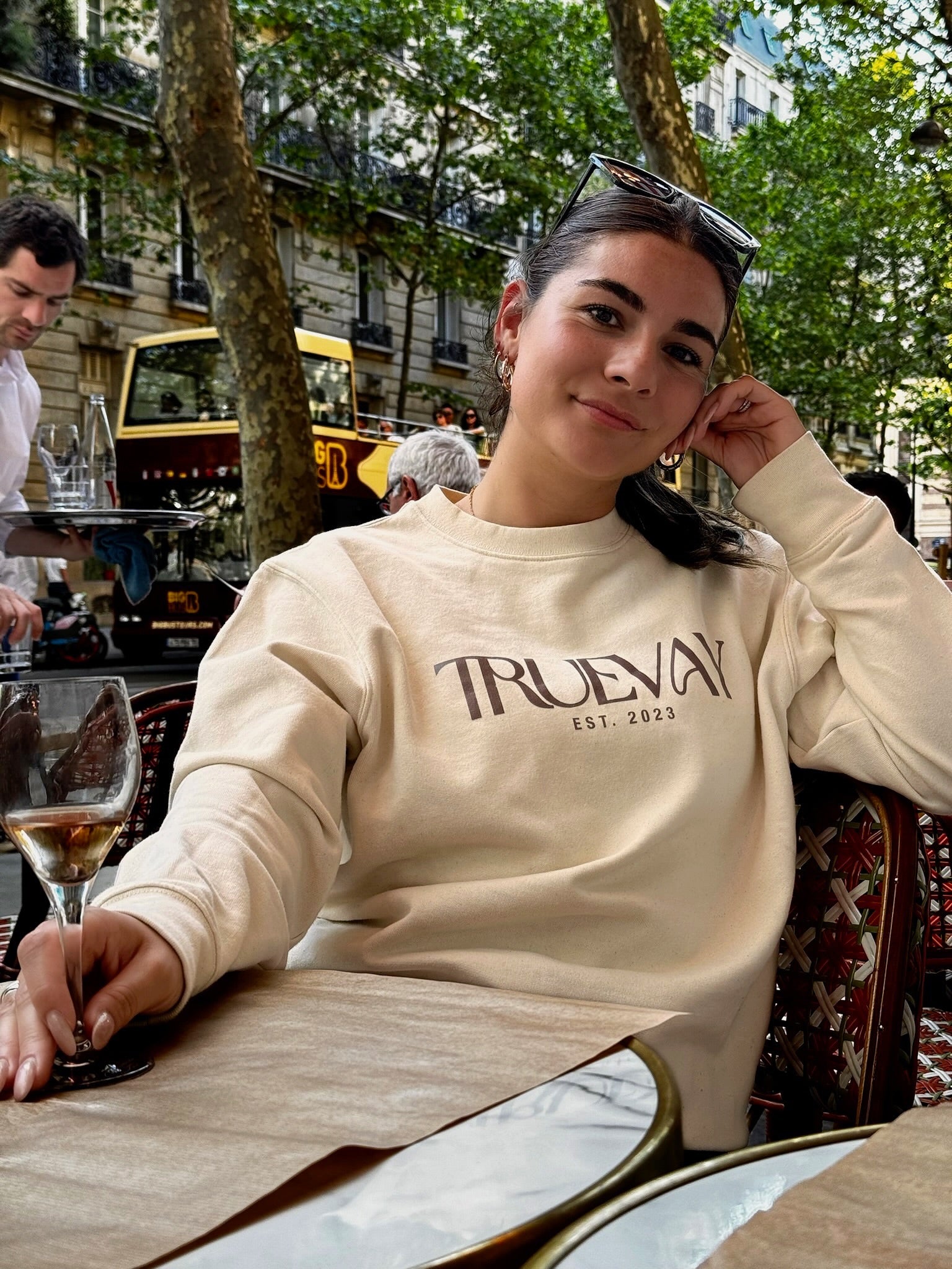 À La Tienne consists of our notorious printed logo, "Truevay", on the front of the crewneck, with its beautiful design of the Eiffel Tower and a woman enjoying her glass of wine, as well as the colourful "Paris" text on the back.