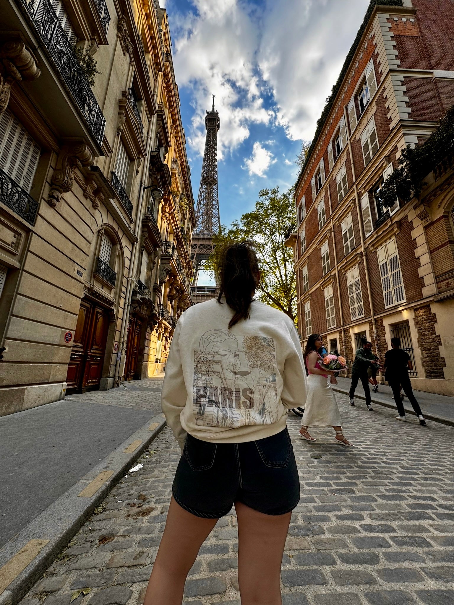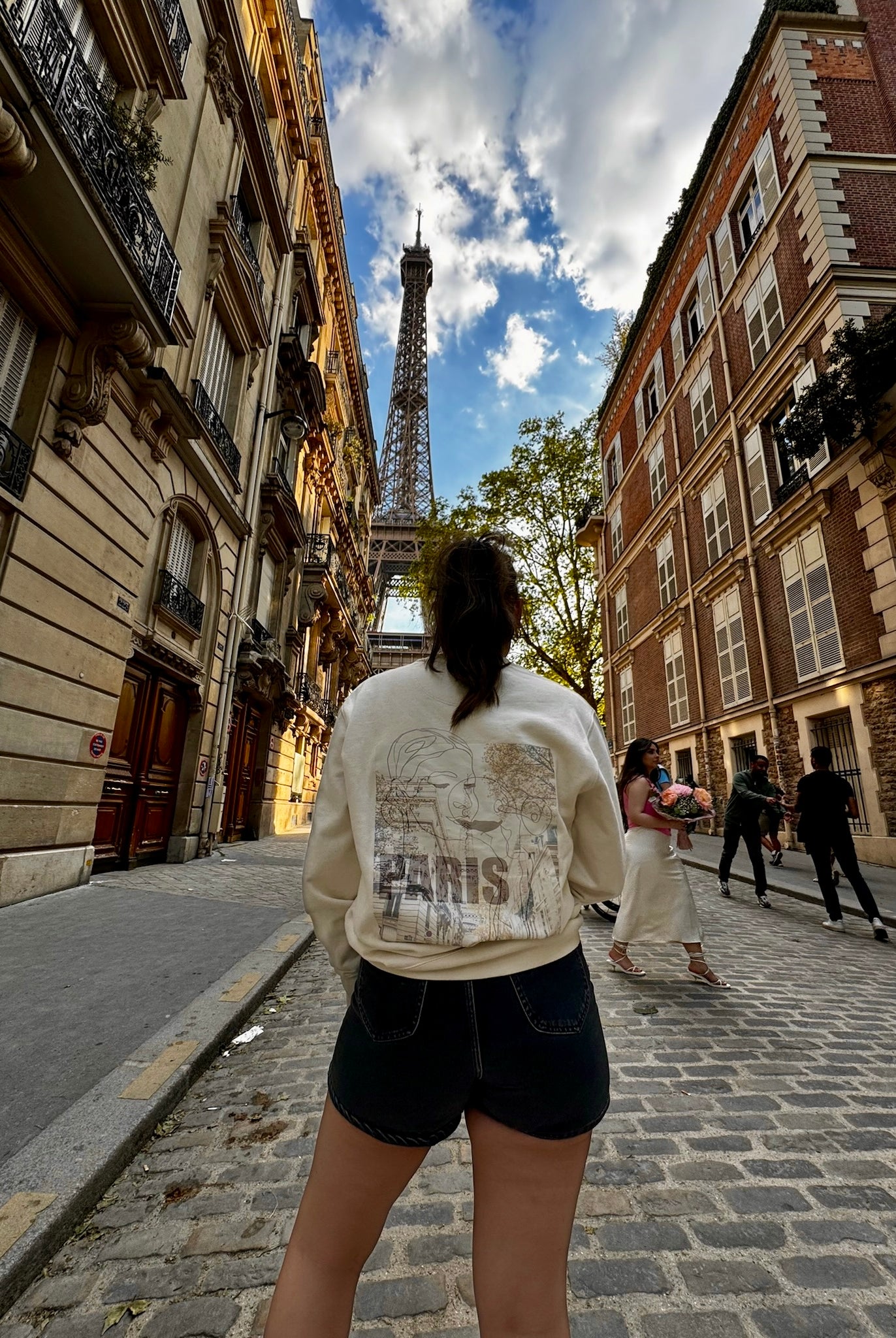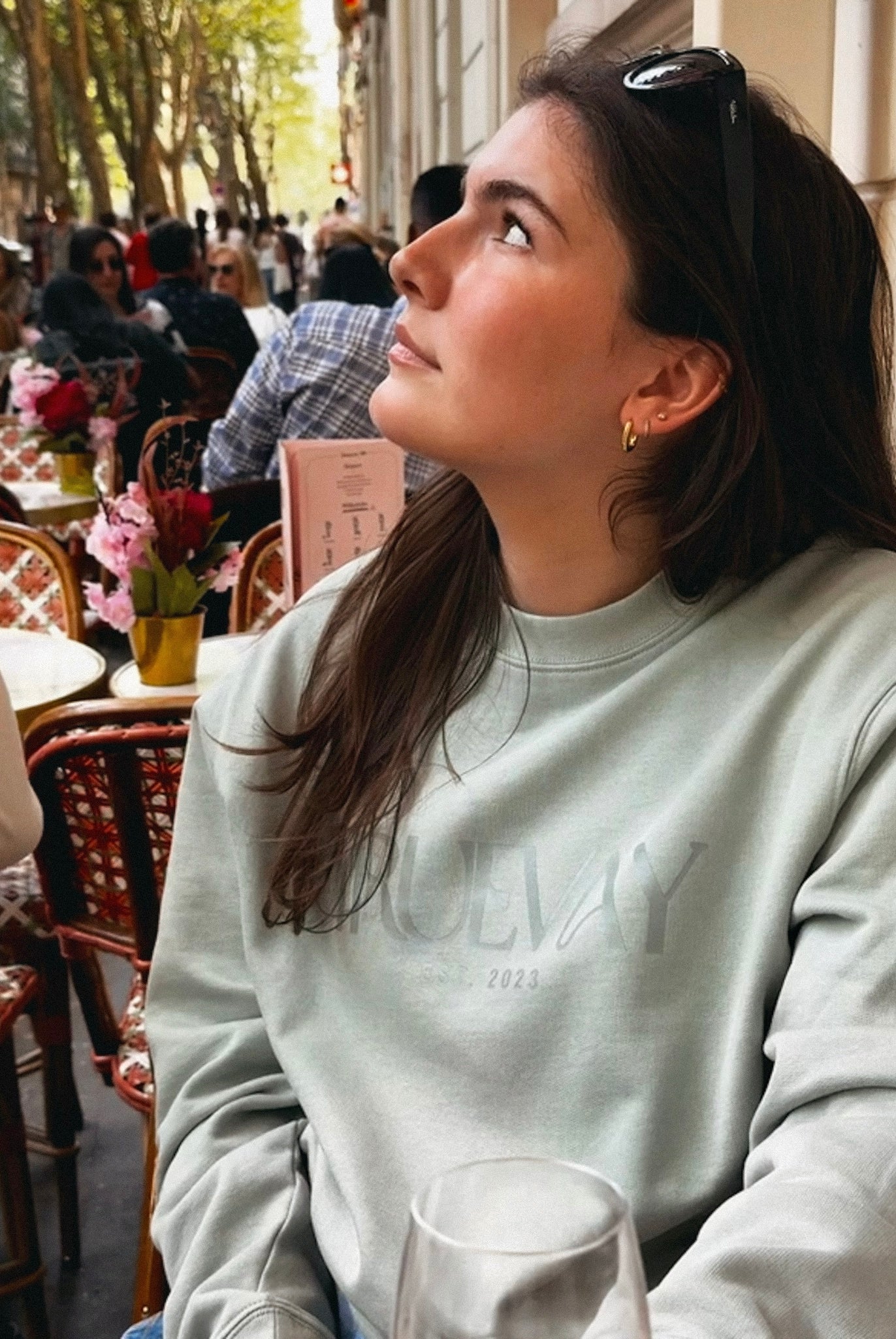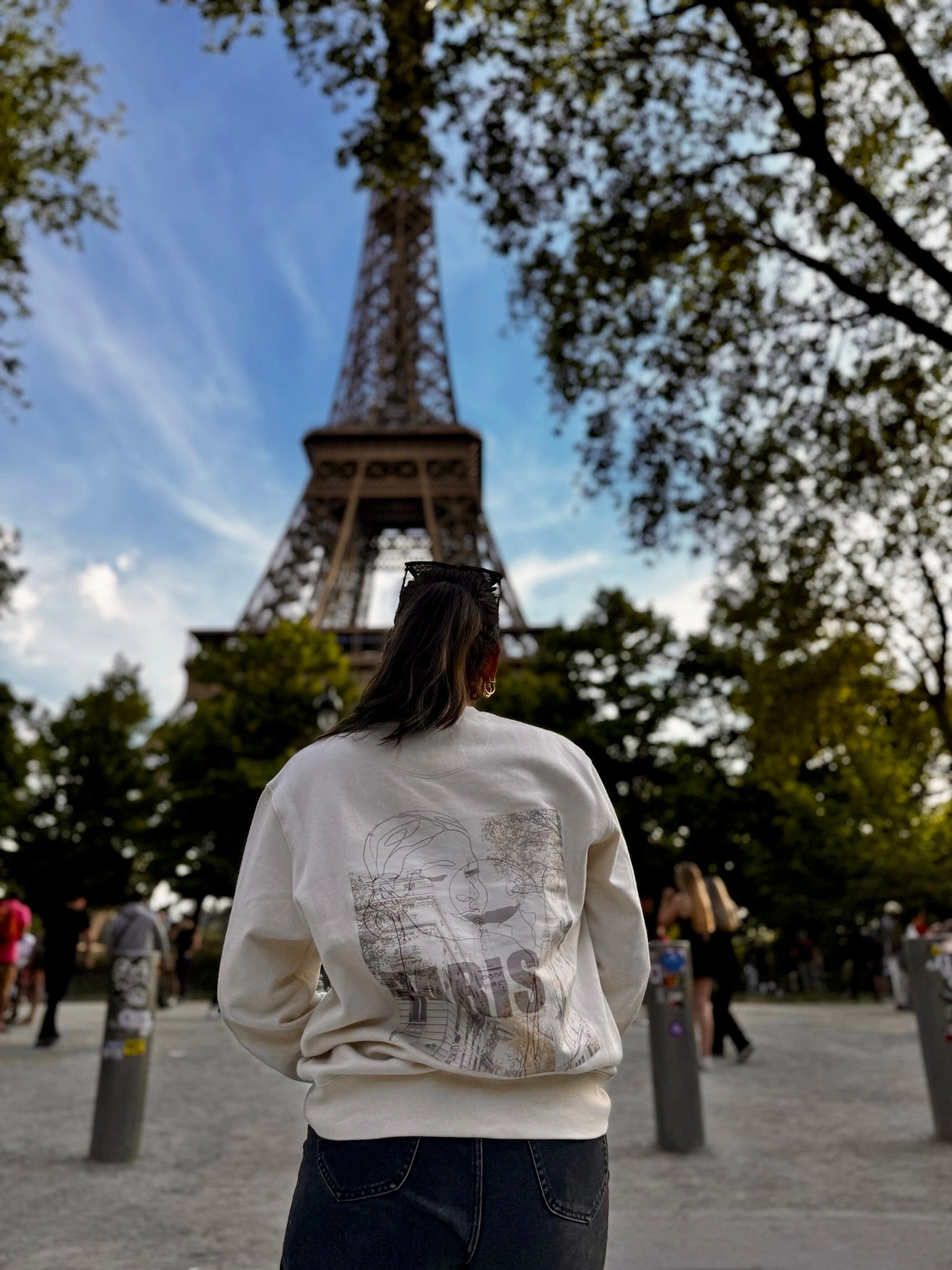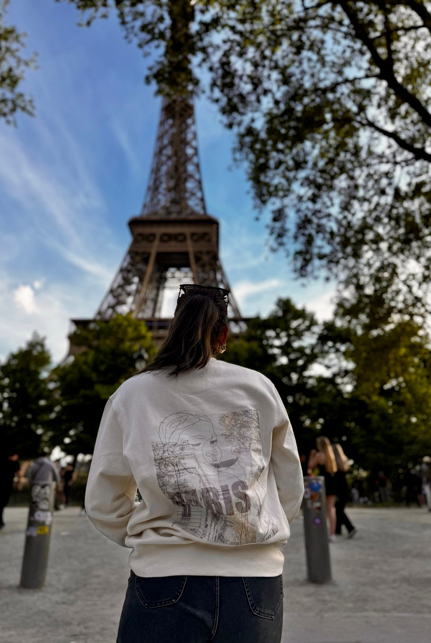 À La Tienne consists of our notorious printed logo, "Truevay", on the front of the crewneck, with its beautiful design of the Eiffel Tower and a woman enjoying her glass of wine, as well as the colourful "Paris" text on the back.