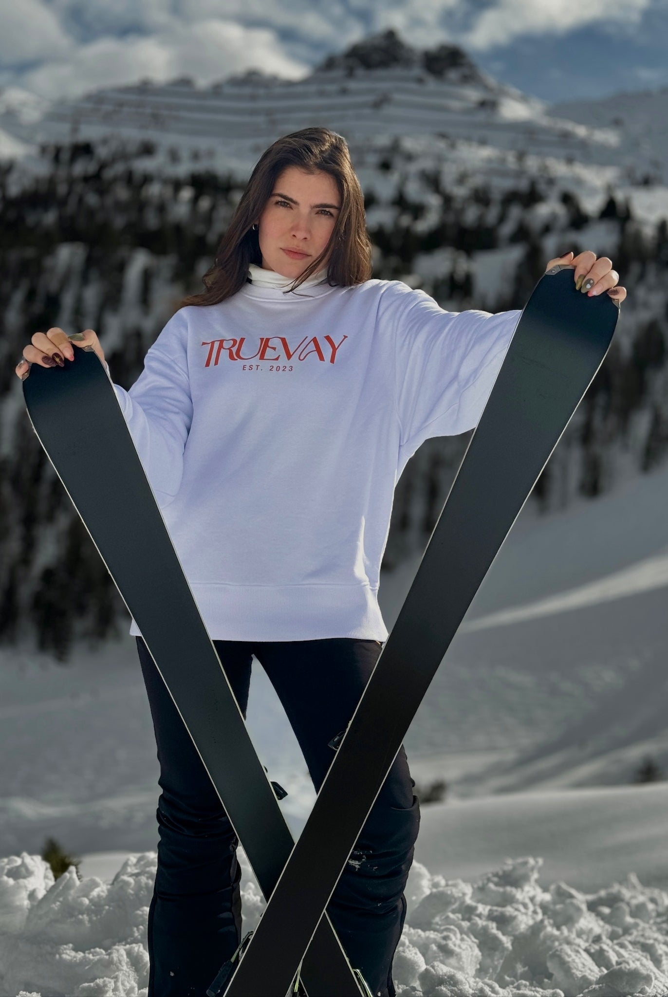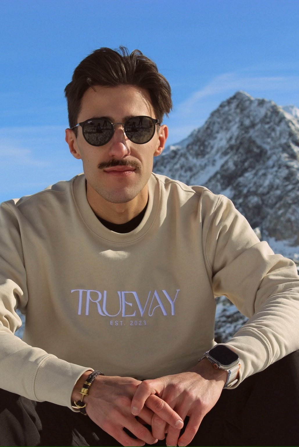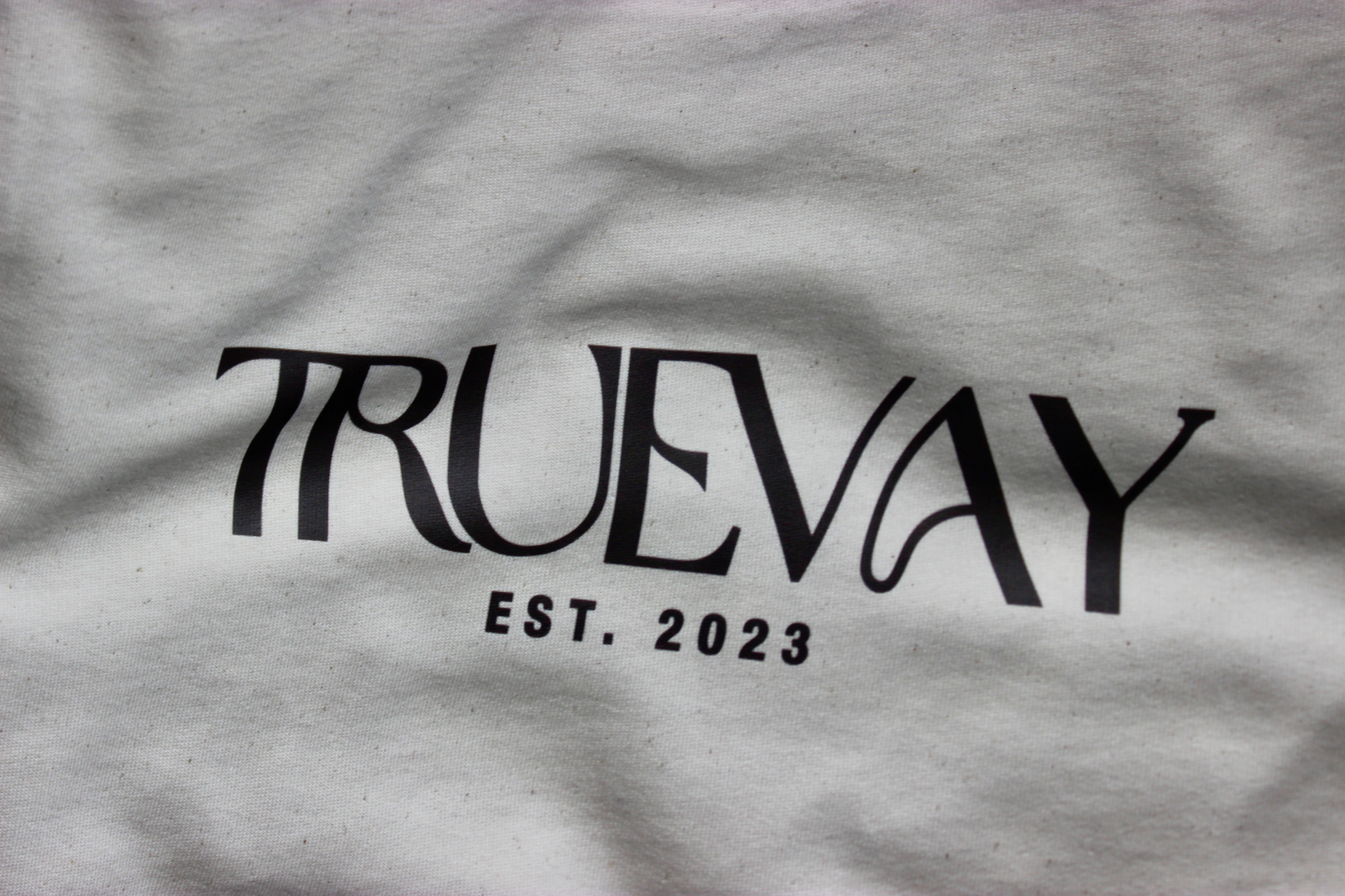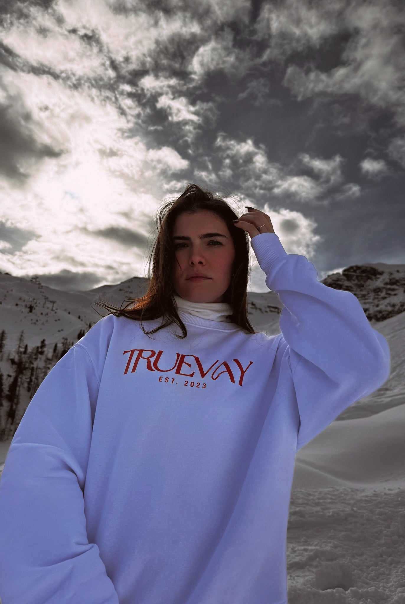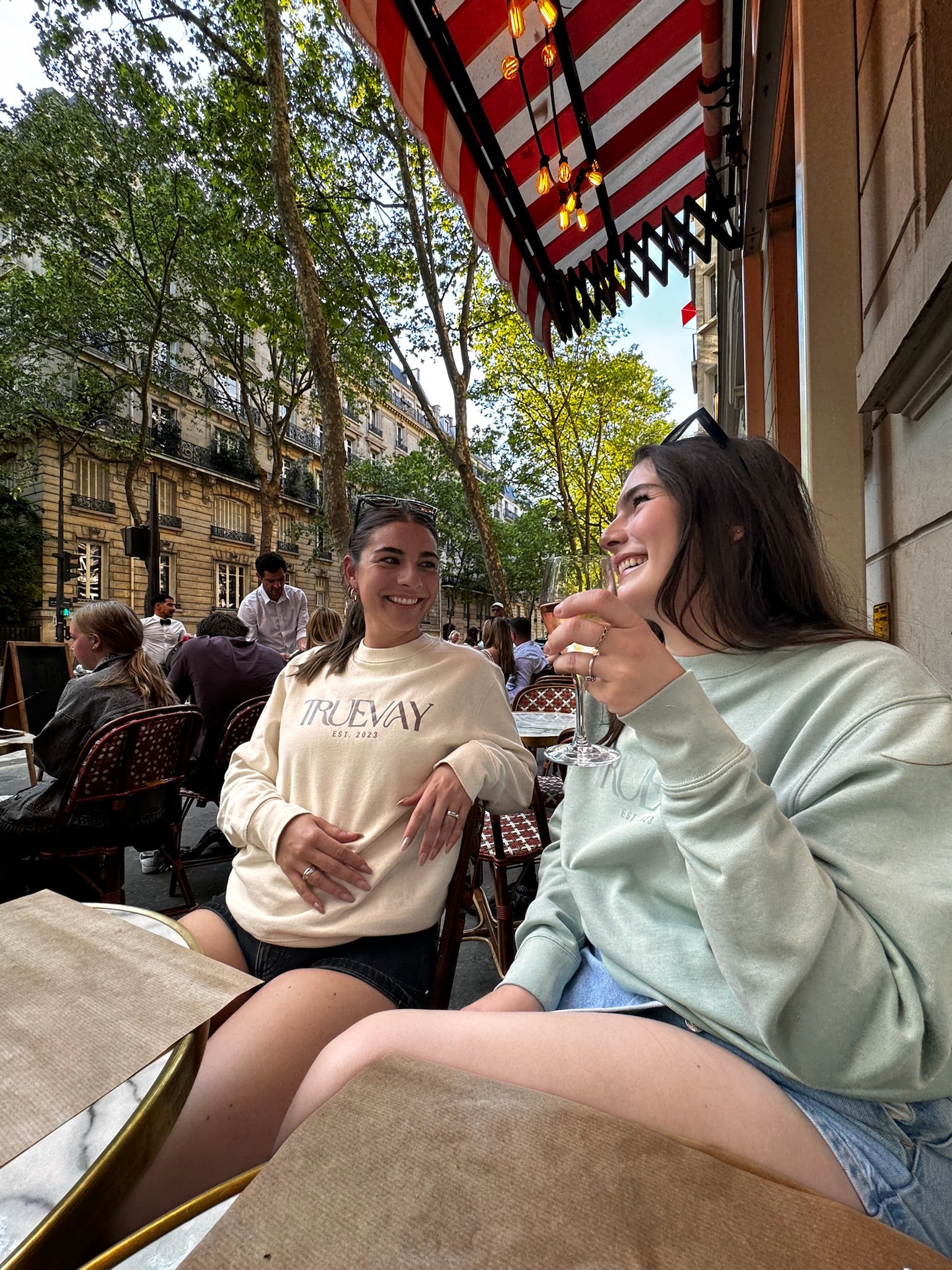 À La Tienne consists of our notorious printed logo, "Truevay", on the front of the crewneck, with its beautiful design of the Eiffel Tower and a woman enjoying her glass of wine, as well as the colourful "Paris" text on the back.