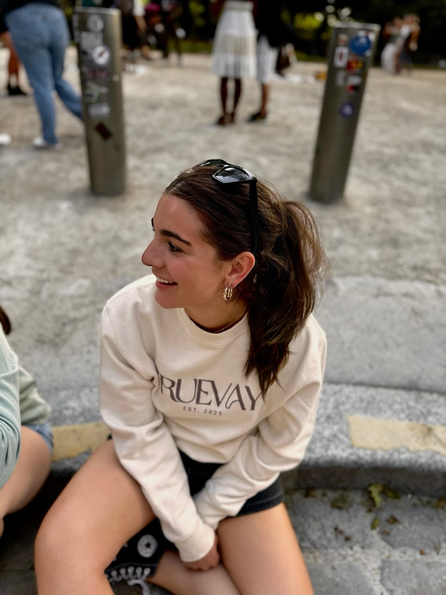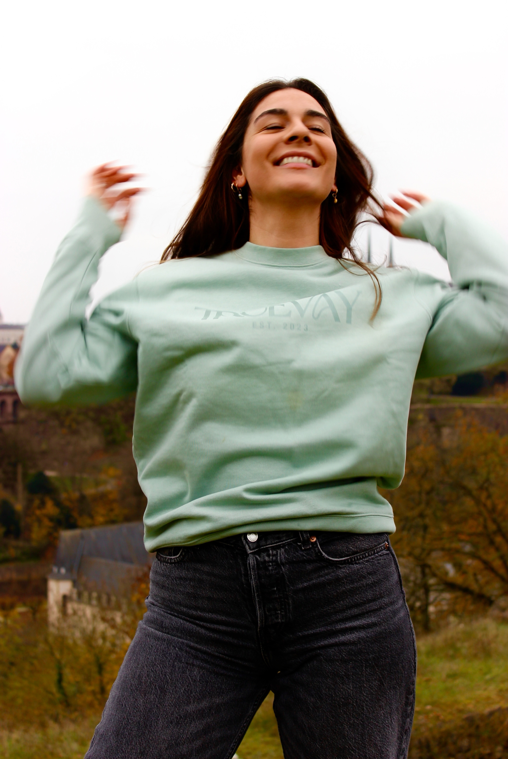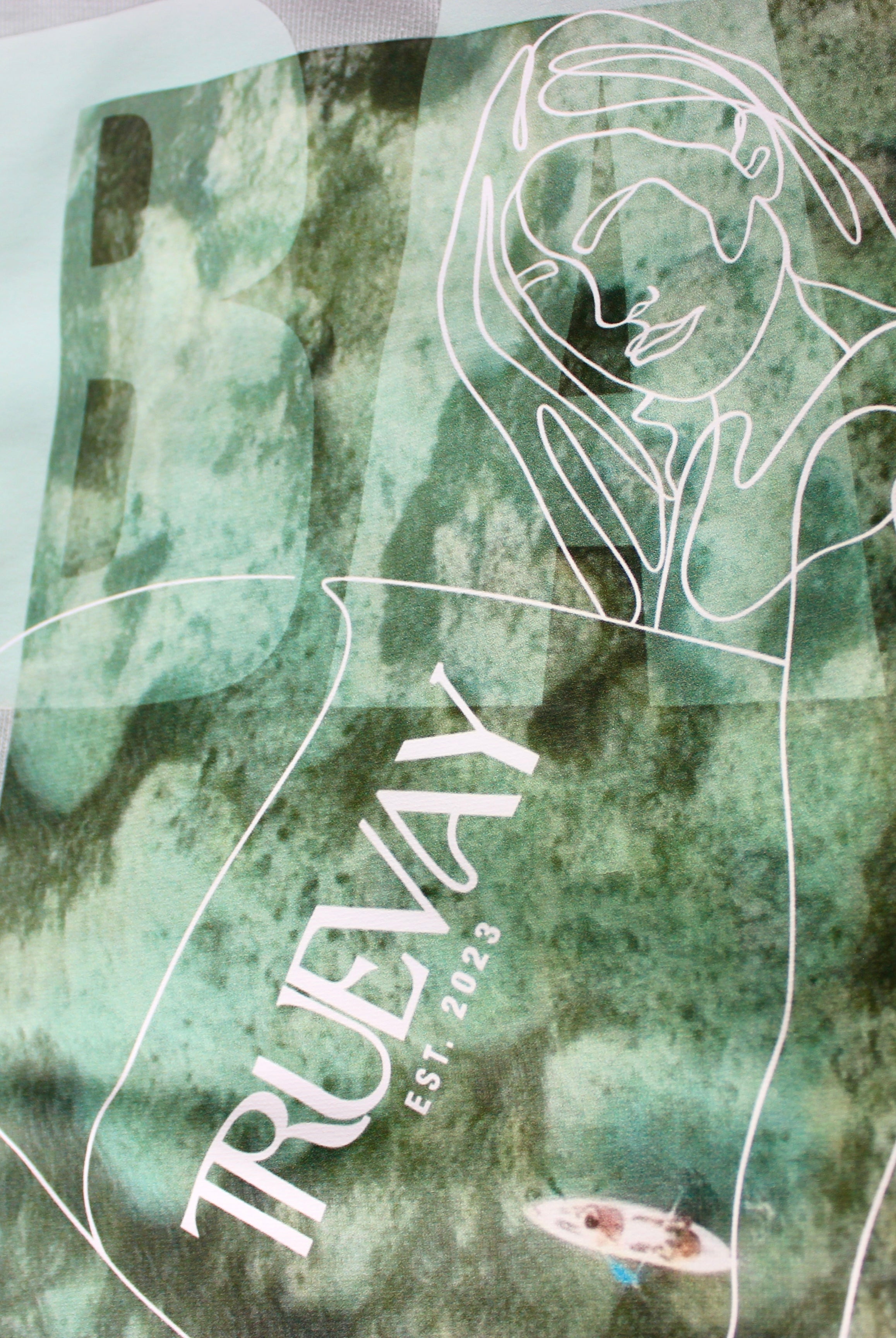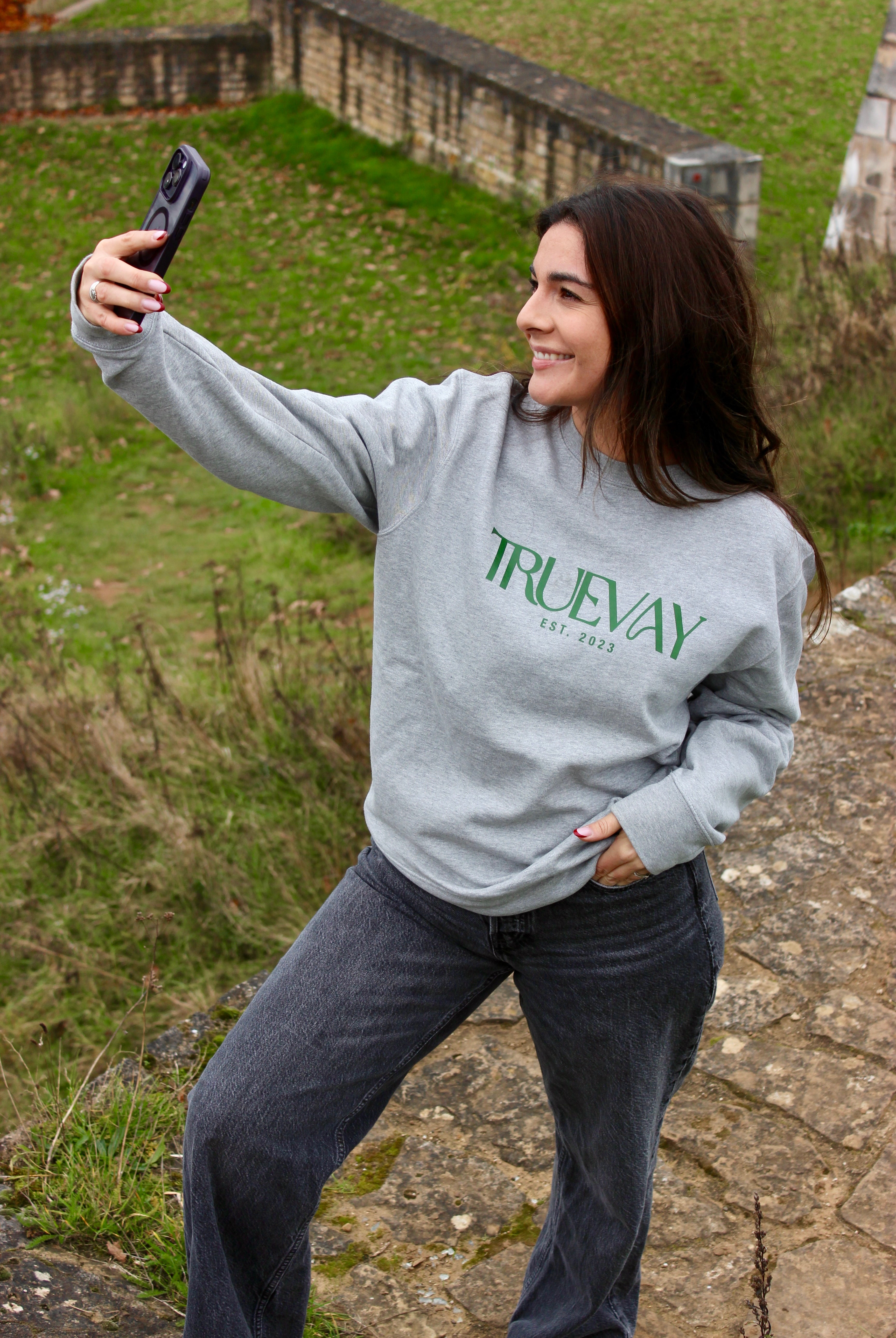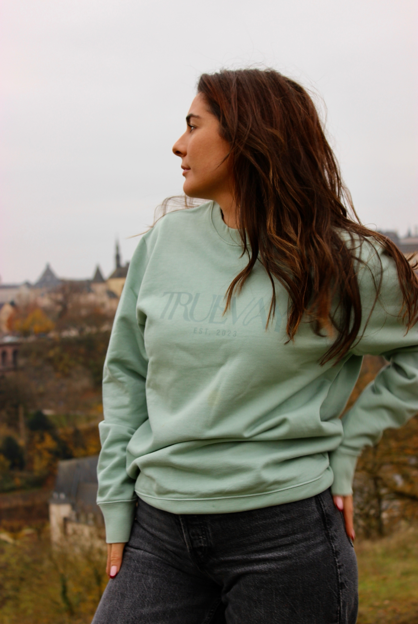 À La Tienne consists of our notorious printed logo, "Truevay", on the front of the crewneck, with its beautiful design of the Eiffel Tower and a woman enjoying her glass of wine, as well as the colourful "Paris" text on the back.