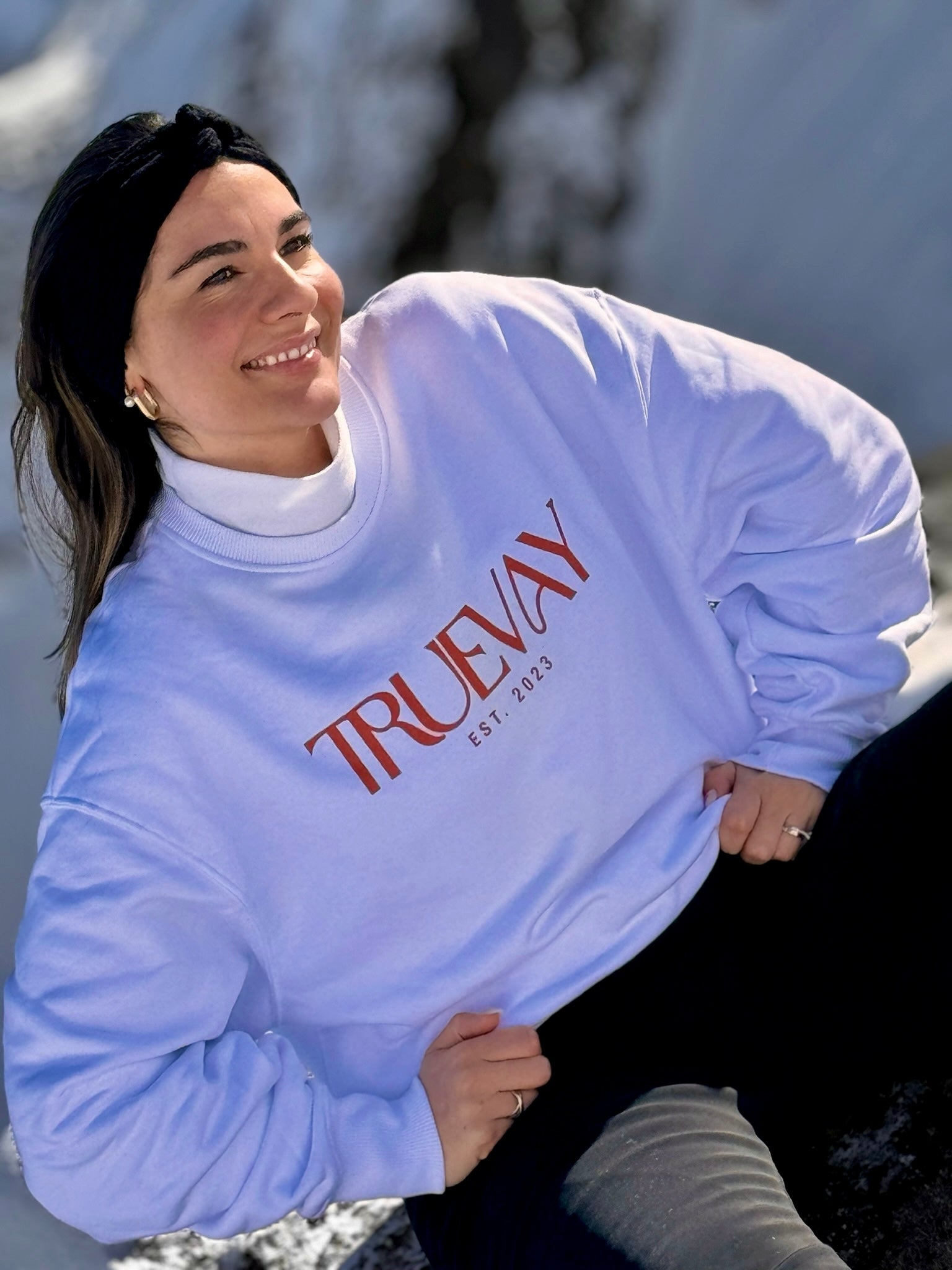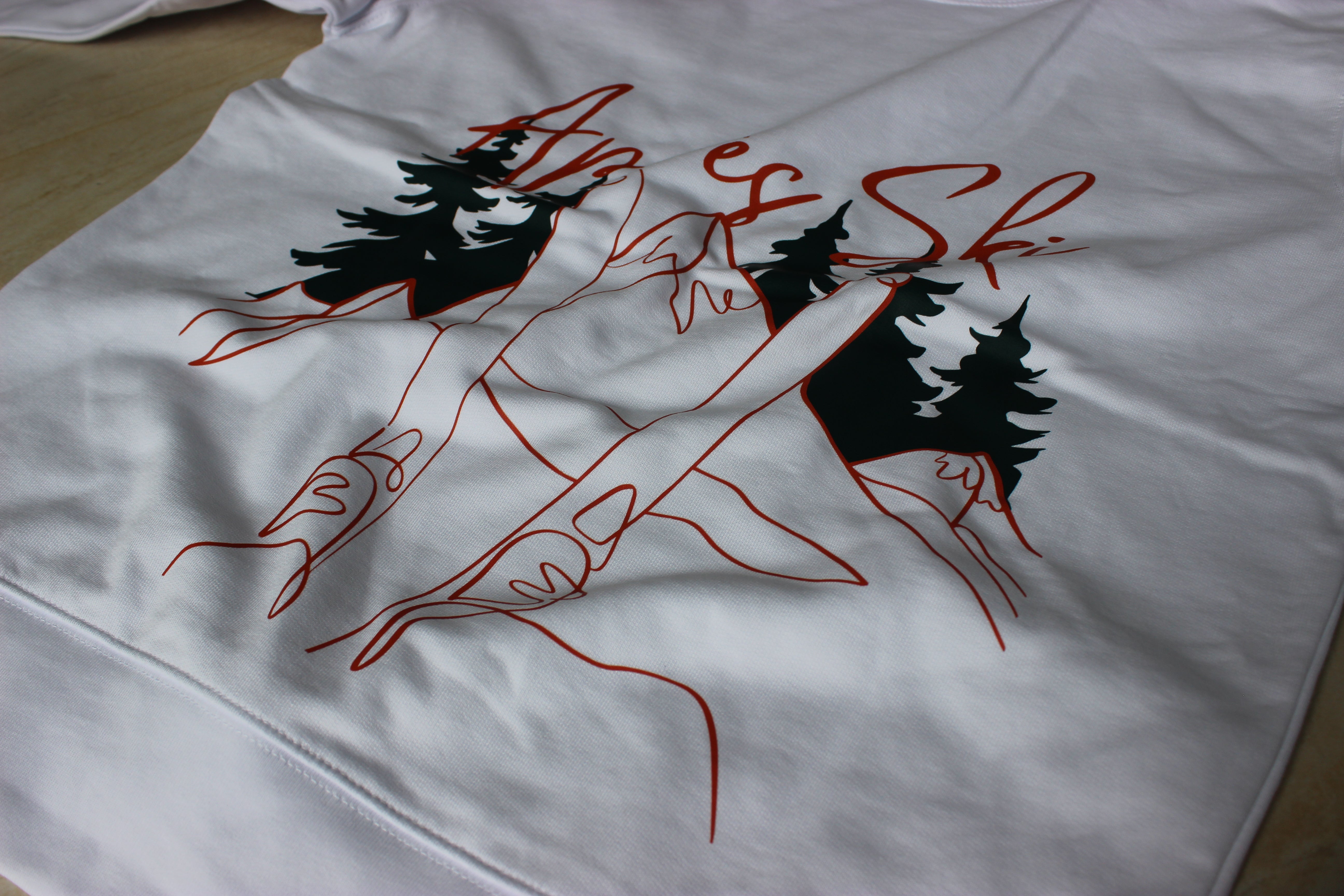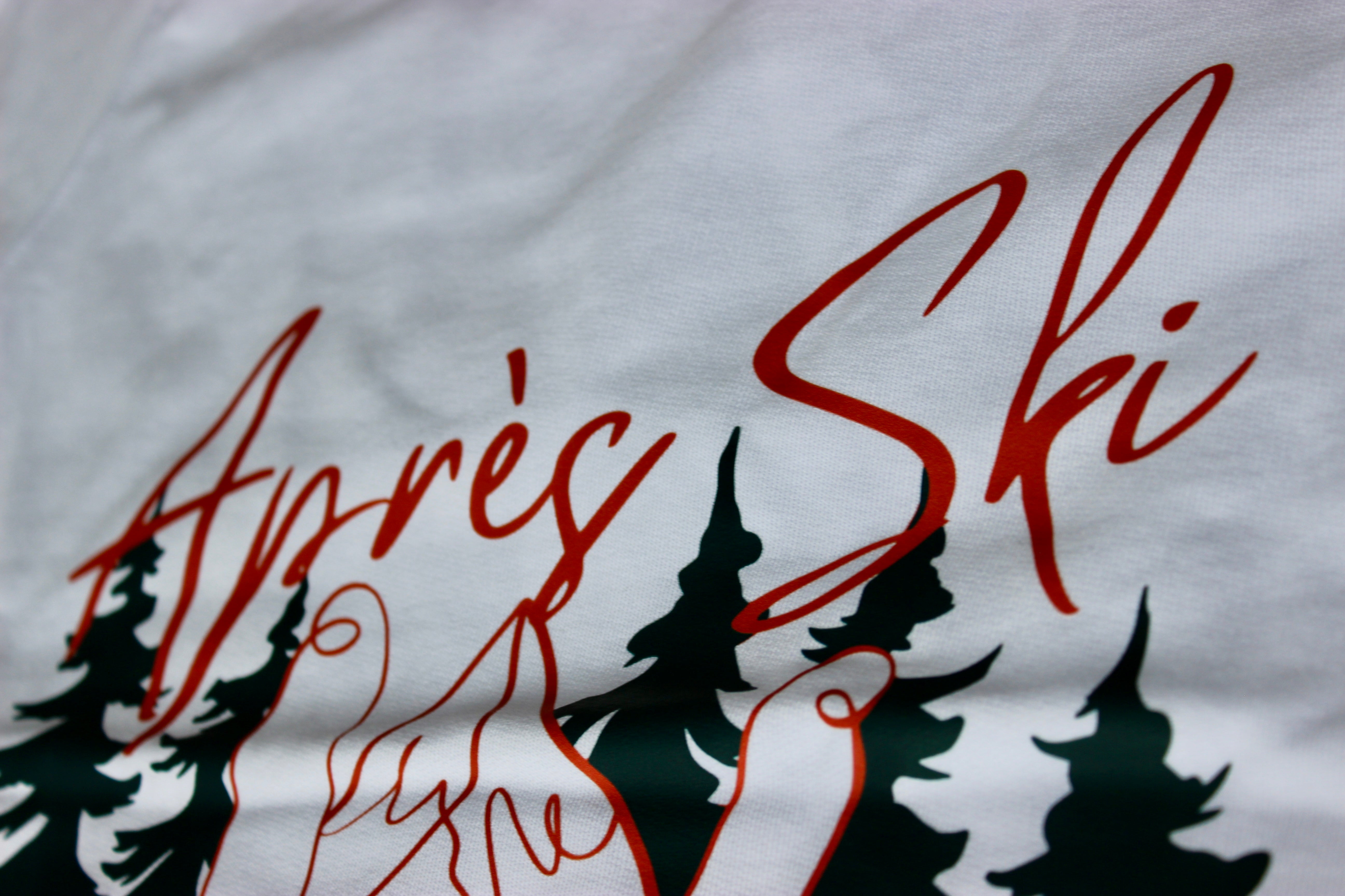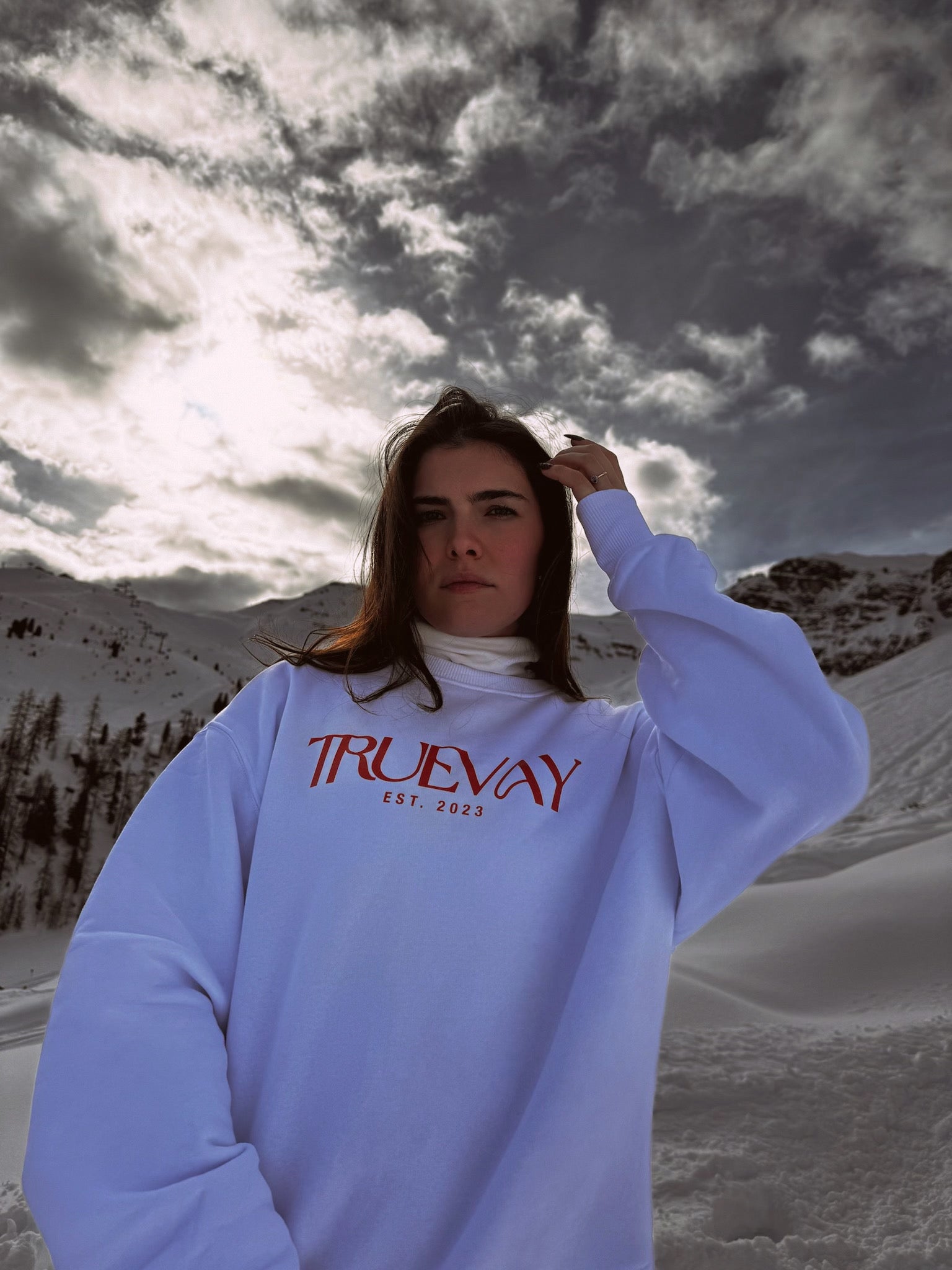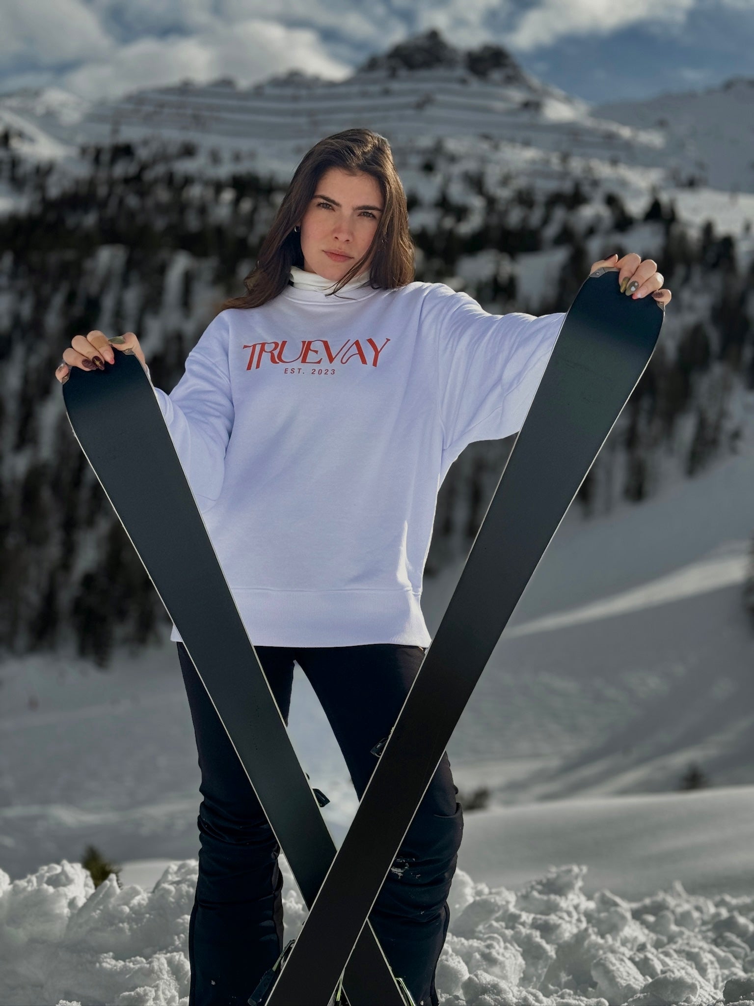 Après Ski consists of our notorious printed logo "Truevay" on the front of the crewneck, with its beautiful snowy ski design and colourful "APRES SKI" text on the back.
